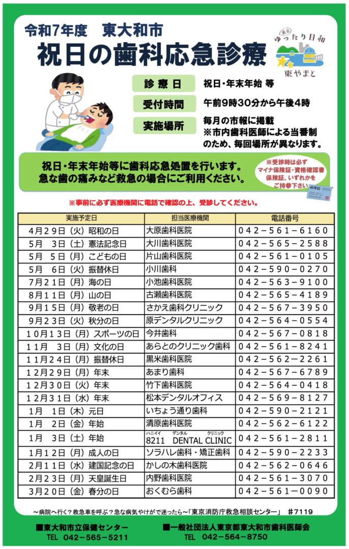 祝日診療の詳細につきましては、「祝日の歯科応急診療|東大和市公式ホームページ」も併せてご確認ください。
